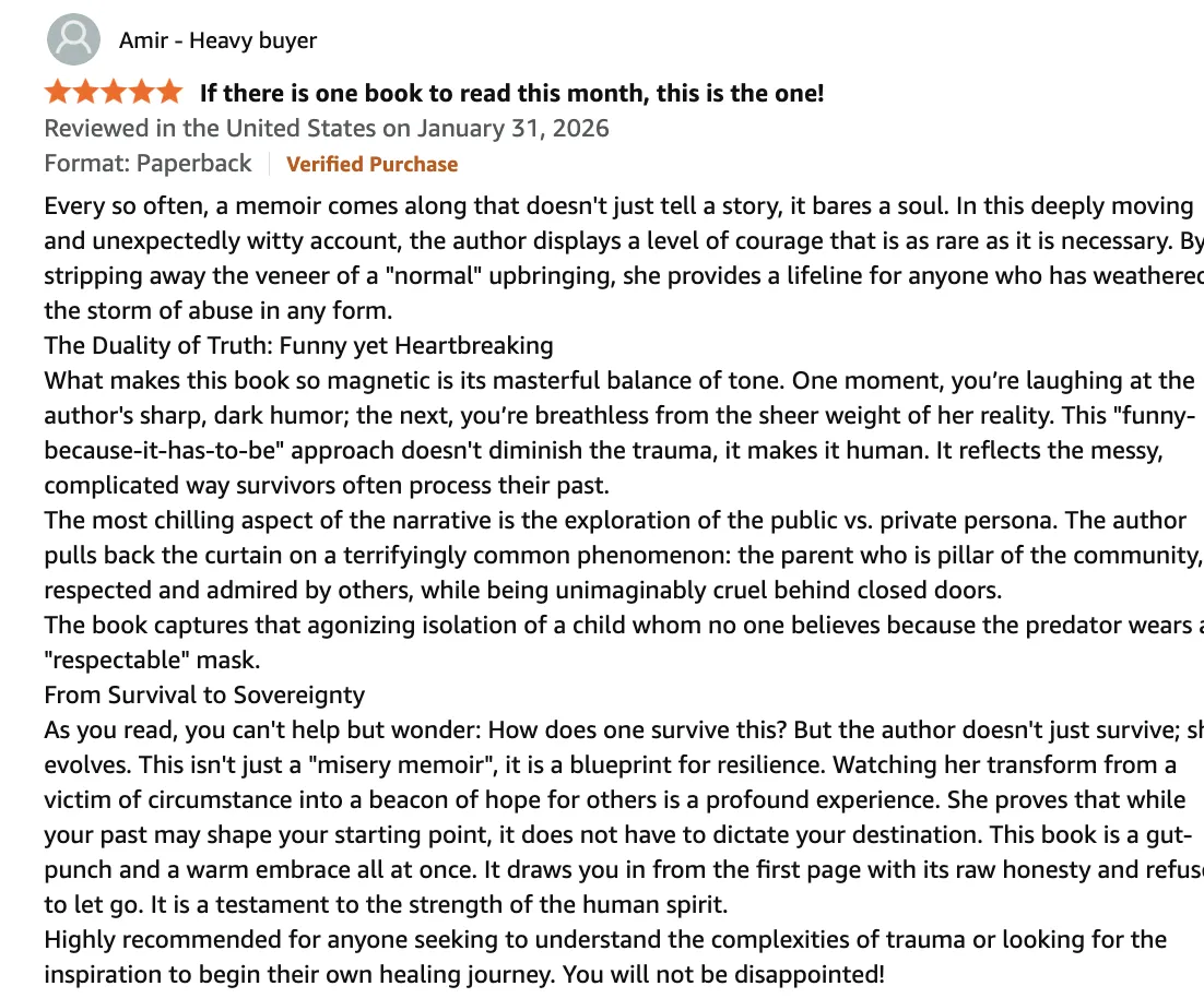 The book moves the way memory does, through moments and snapshots. Hauk takes readers from her childhood in Hawai'i, surrounded by the beauty and culture of 'ohana, to courtrooms, hospitals, classrooms, and even state government offices. Behind the peaceful island setting, she was living through private trauma. She does not describe the abuse in graphic detail, but she gives enough insight for readers to understand the weight of what she endured at the hands of her father; a man who appeared respectable to the outside world. What stays with you isn't shock, but the quiet truth about silence, not being believed, and finding a way to survive anyway.