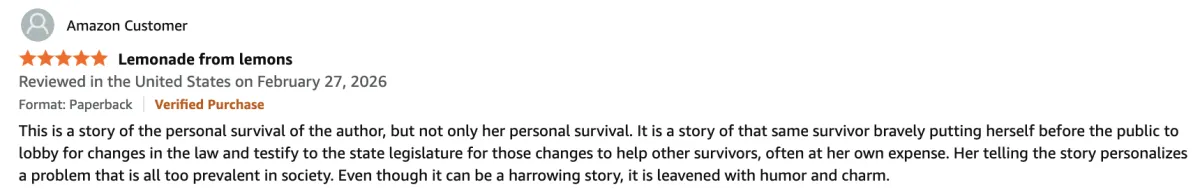 As the book progresses, we see Hauk grow into a devoted mother of four, a passionate music teacher who pours herself into her students, and an advocate determined to change laws that protect abusers. Her personal court case, along with her efforts to extend the statute of limitations for survivors, becomes a powerful turning point. Through this work, she shows that healing is not just personal, it can also help others.