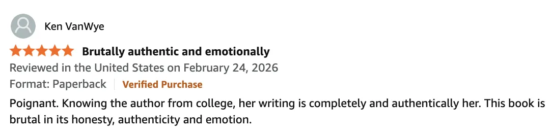 Hauk's writing is reflective and conversational. It feels as though she is sitting across from you sharing her story in an honest, open and emotional way. On occasion, she employs humor. Not to make light of what happened, but because sometimes laughter is how people survive. That balance between heartbreak and humor makes the book easier to carry, even when the subject is heavy. It allows readers to sit with difficult truths and come away with greater clarity and understanding.
